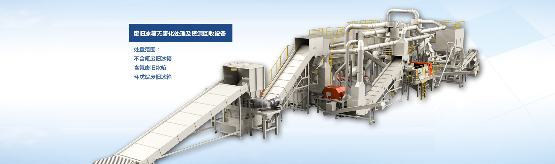 公司自主研發(fā)的廢舊冰箱無害化處理及資源回收技術(shù)及設(shè)備, 獨(dú)具 “雙軸撕碎機(jī)+立式破碎機(jī)+大風(fēng)量稀釋環(huán)戊烷氣體”的專利組合設(shè)計(jì), 主要用于對(duì)廢舊冰箱中的各種原材料進(jìn)行分離、 回收和利用, 具有自主知識(shí)產(chǎn)權(quán), 經(jīng)國(guó)家工業(yè)和信息化部科技成果鑒定為 “填補(bǔ)國(guó)內(nèi)空白, 達(dá)到國(guó)際先進(jìn)水平” 。